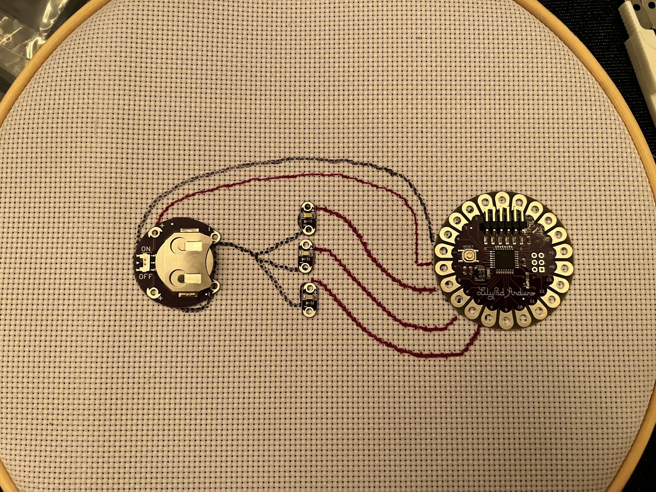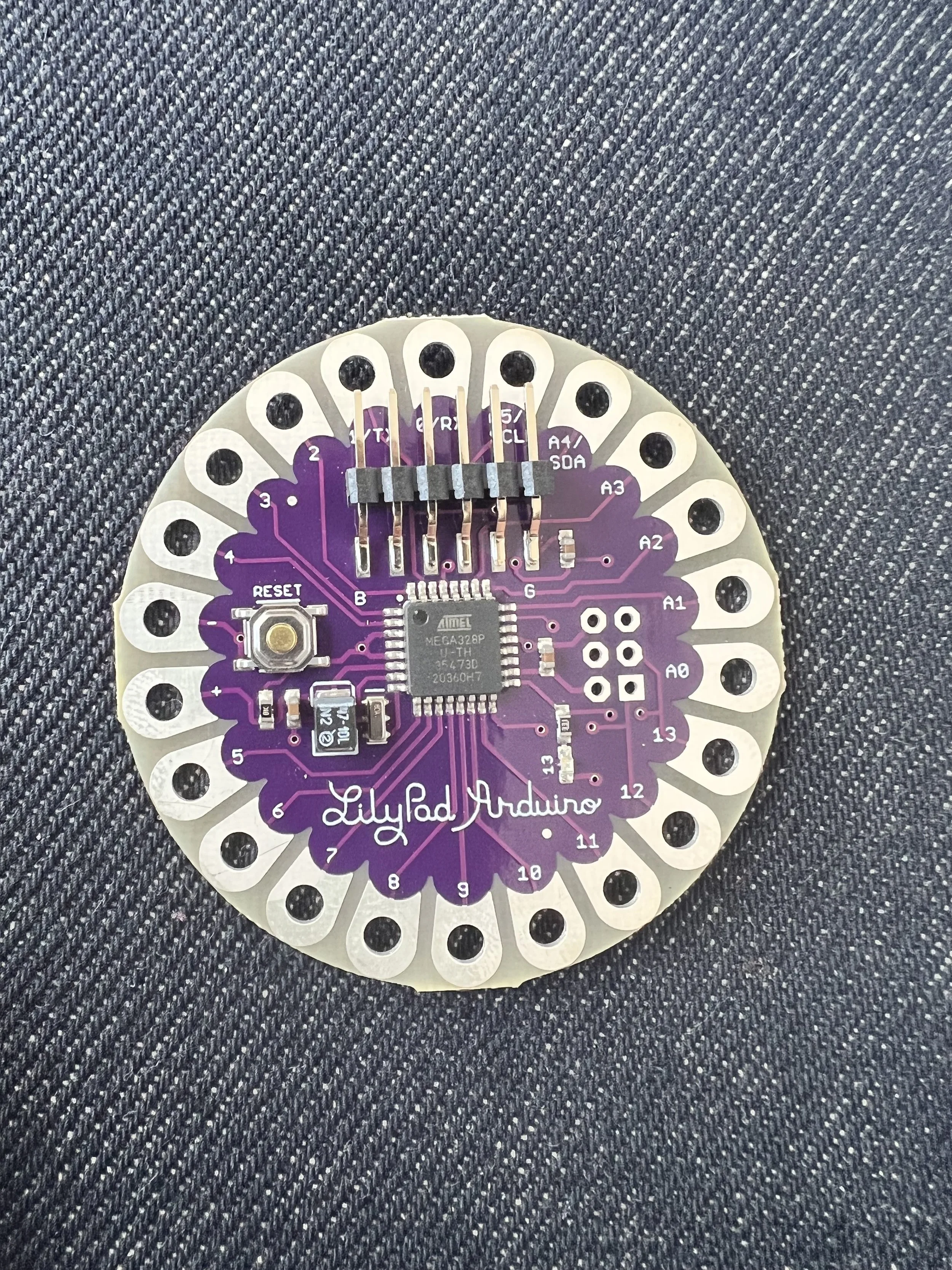 However, the battery died pretty quickly, and the lights weren’t bright enough to be seen in a bright room, so I decided to pivot slightly, and plan on powering the LilyPad through its power cable, hooked up to a computer or power bank rather than a self-contained battery.