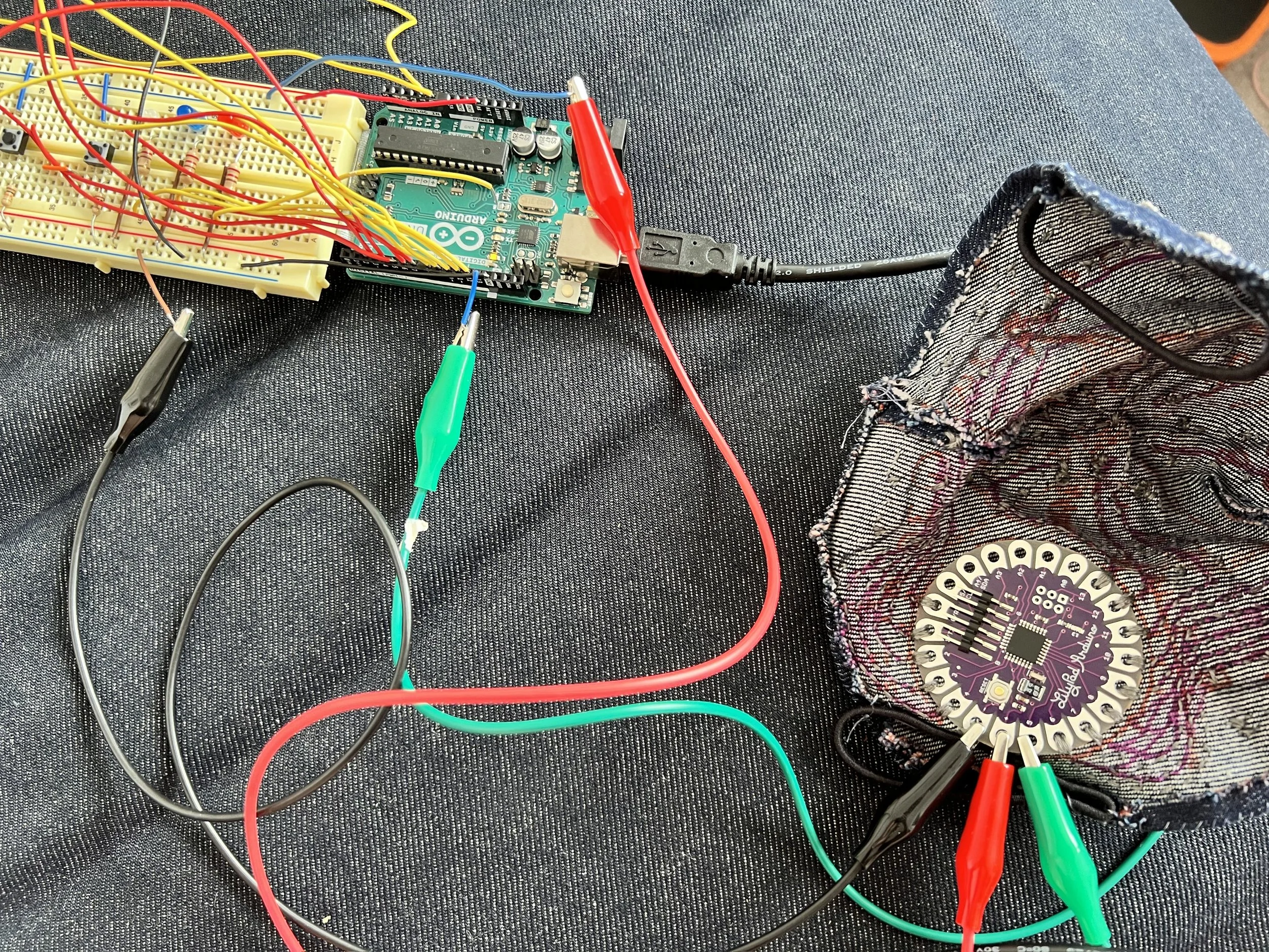 After all of the circuits were carefully sewn in accordance with the drawn circuit plan, I tested different light patterns and looks by interfacing the LilyPad with an Arduino UNO which was already running working code. I also tested out a few other components at this stage, for use in future developments, such as button control and adding lights mounted elsewhere.