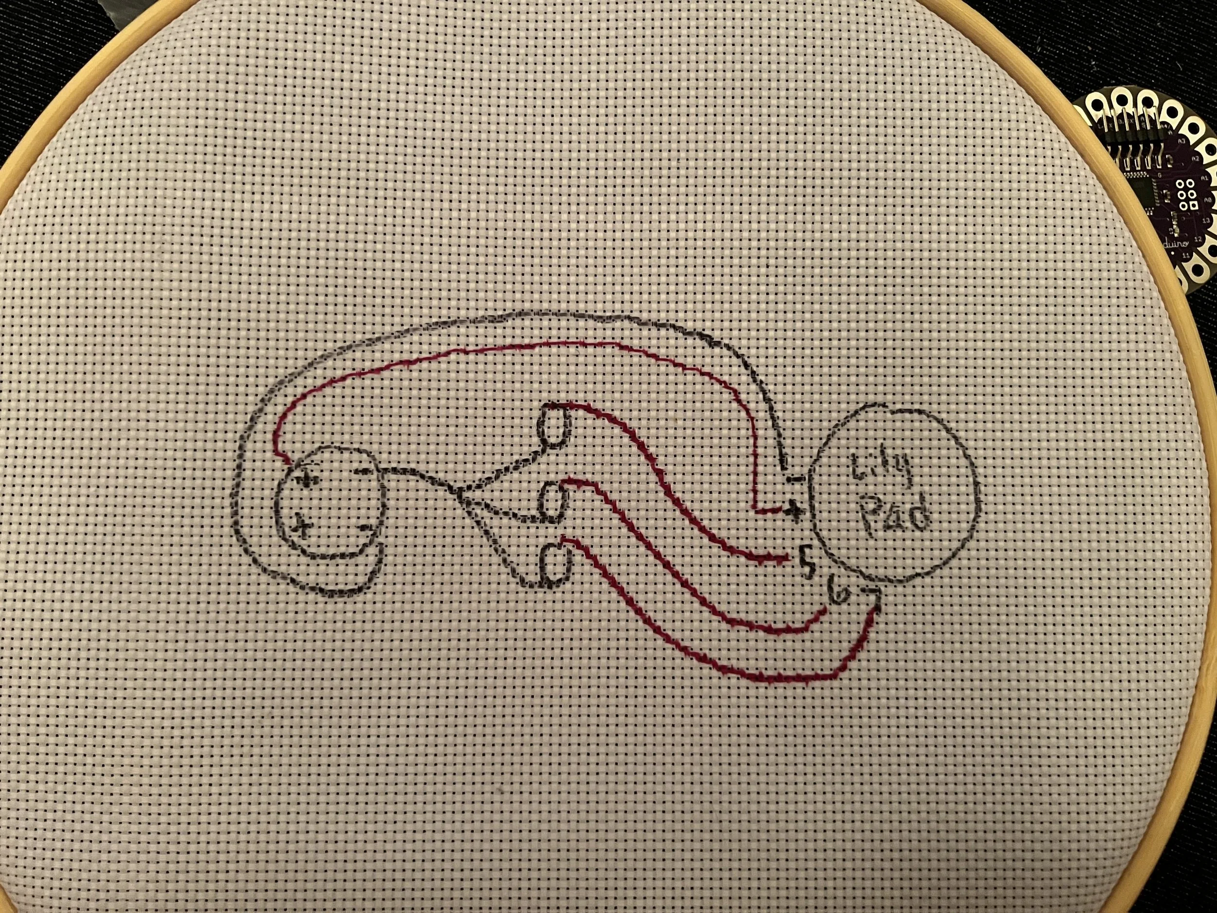 I am a very visual person, especially when working with textiles, so I loved being able to map out my circuit by drawing straight onto the fabric. This was the plan for my earliest test, using an embroidery hoop to keep the fabric taut and testing that I could get power and rudimentary light control attached to fabric.