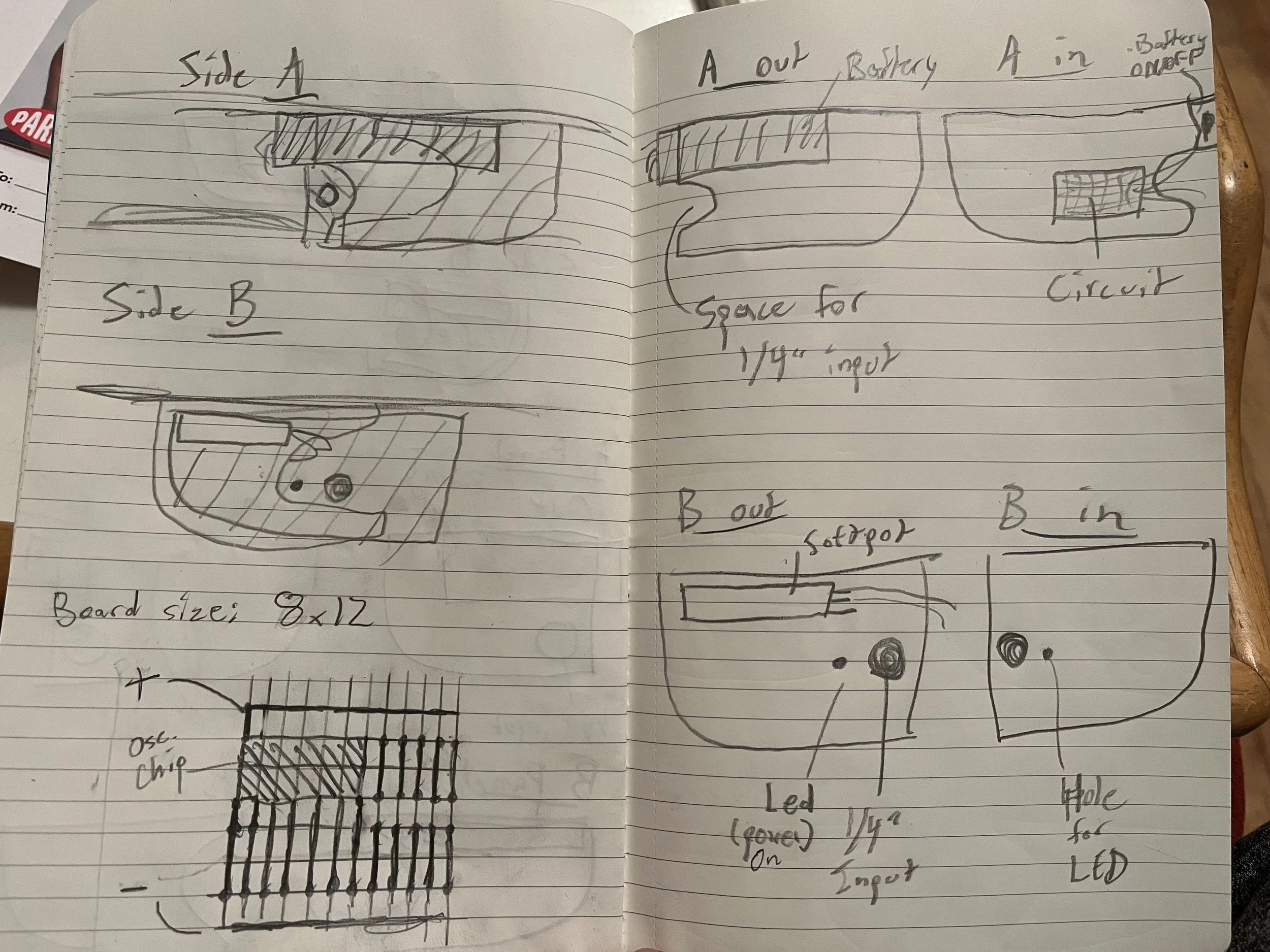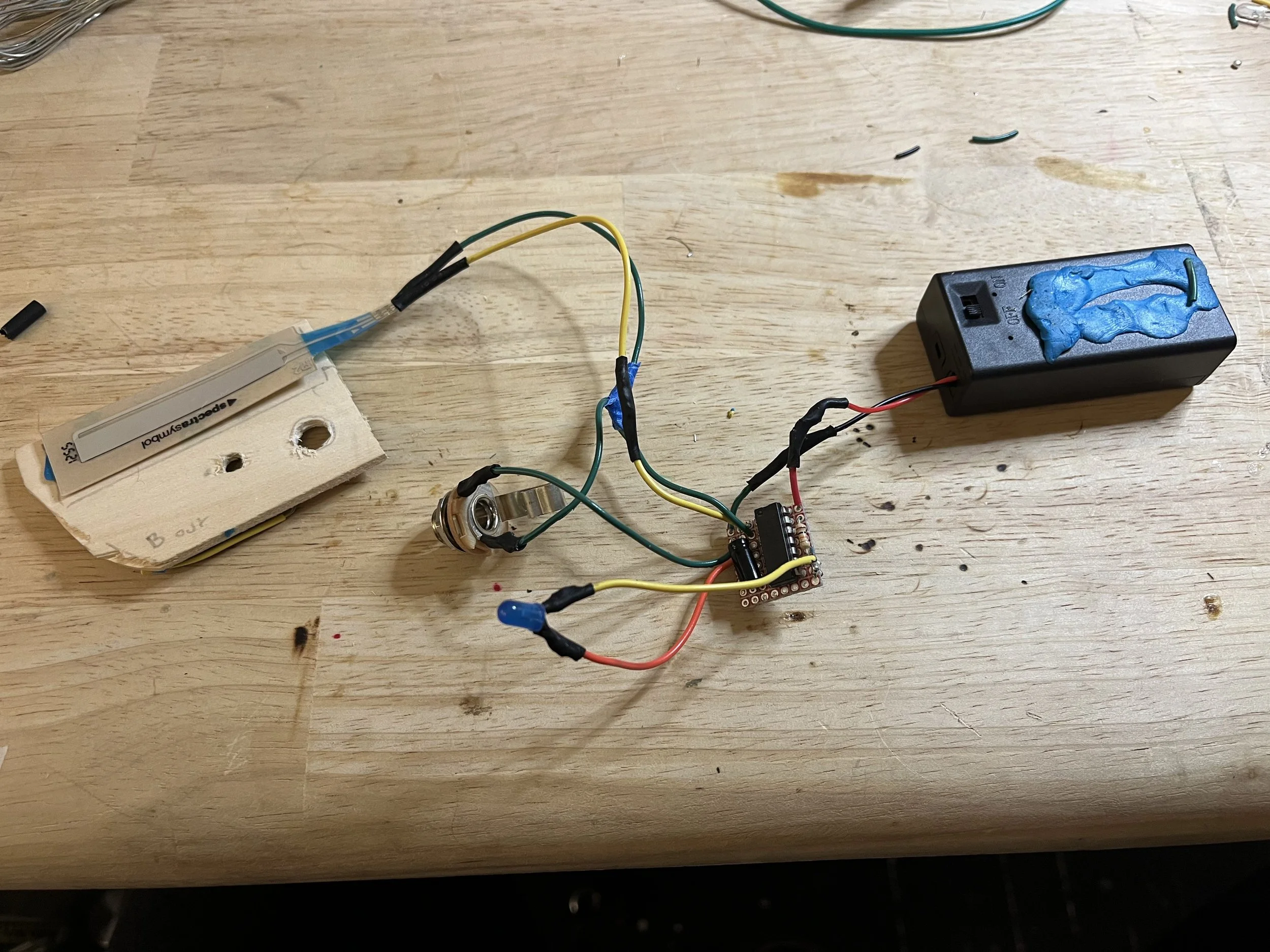 The circuit involved a simple oscillator, connected to a 1/4” output. In order to control the pitch, I would have to add a resistor that received some sort of input from the performer.