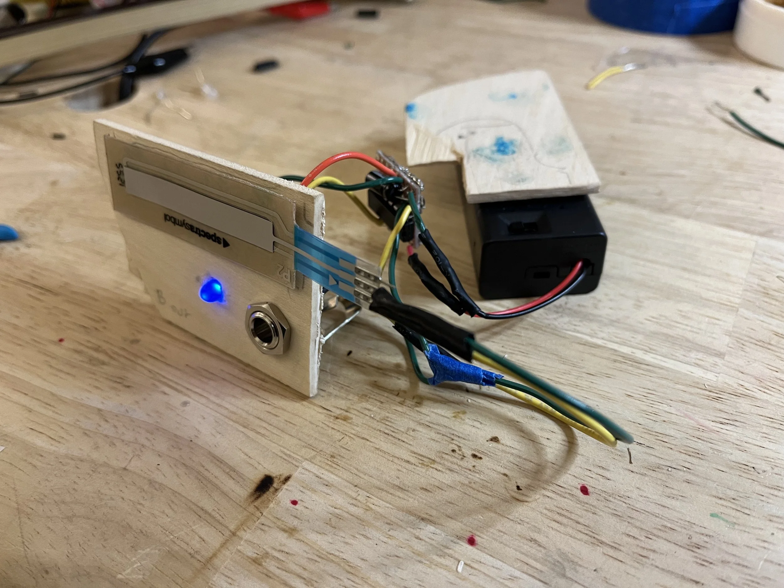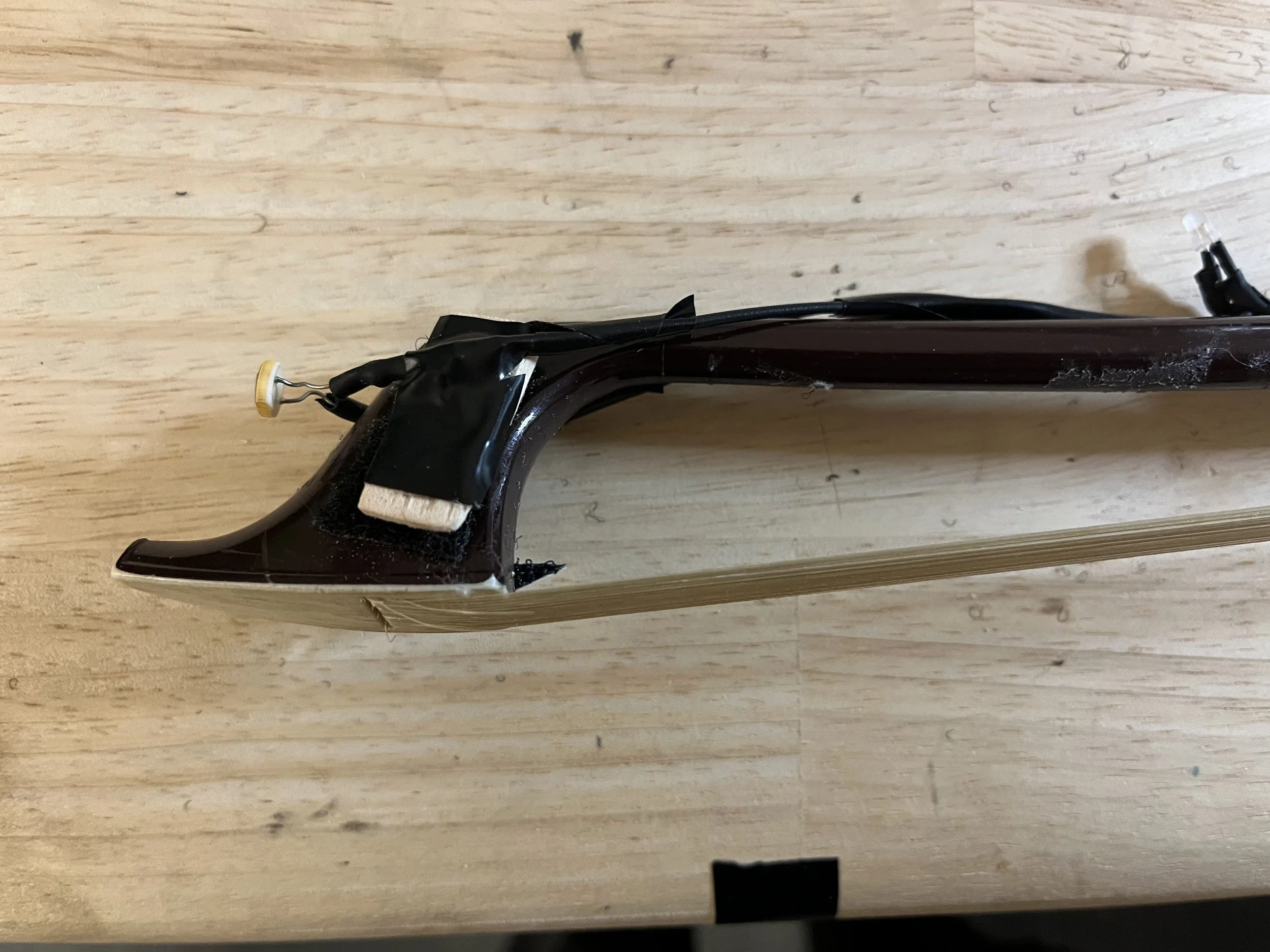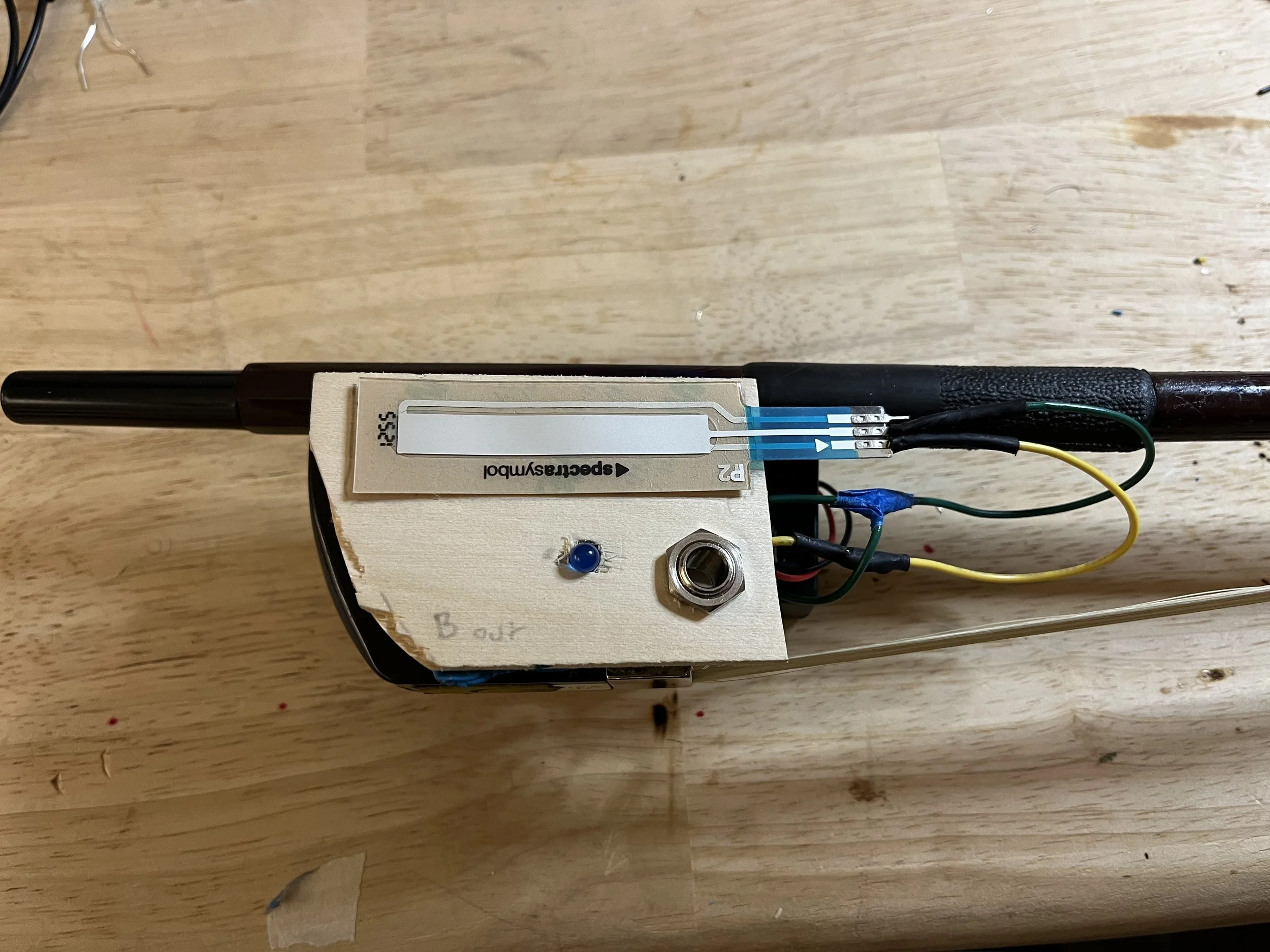 The first completed version involved a touch pad on the frog of the bow, called a SoftPot (soft potentiometer). This changed the resistance based on finger placement. I placed the SoftPot on the frog in a way that worked well with traditional bow technique.