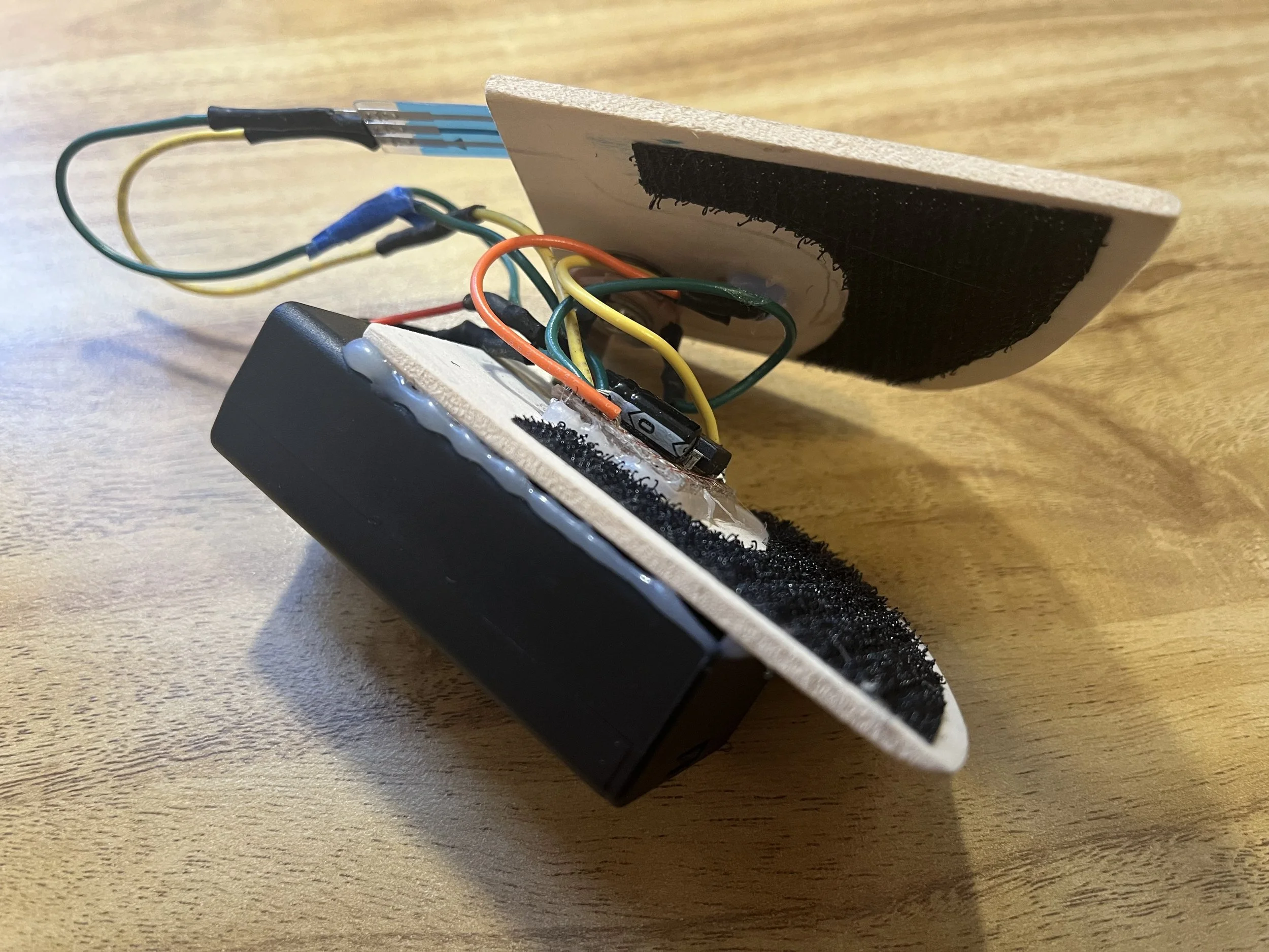 In order to mount the circuit, SoftPot, output jack, and battery, I cut wood panels that attach to the bow with velcro. This way, the whole mechanism can be taken on and off without damaging the bow.