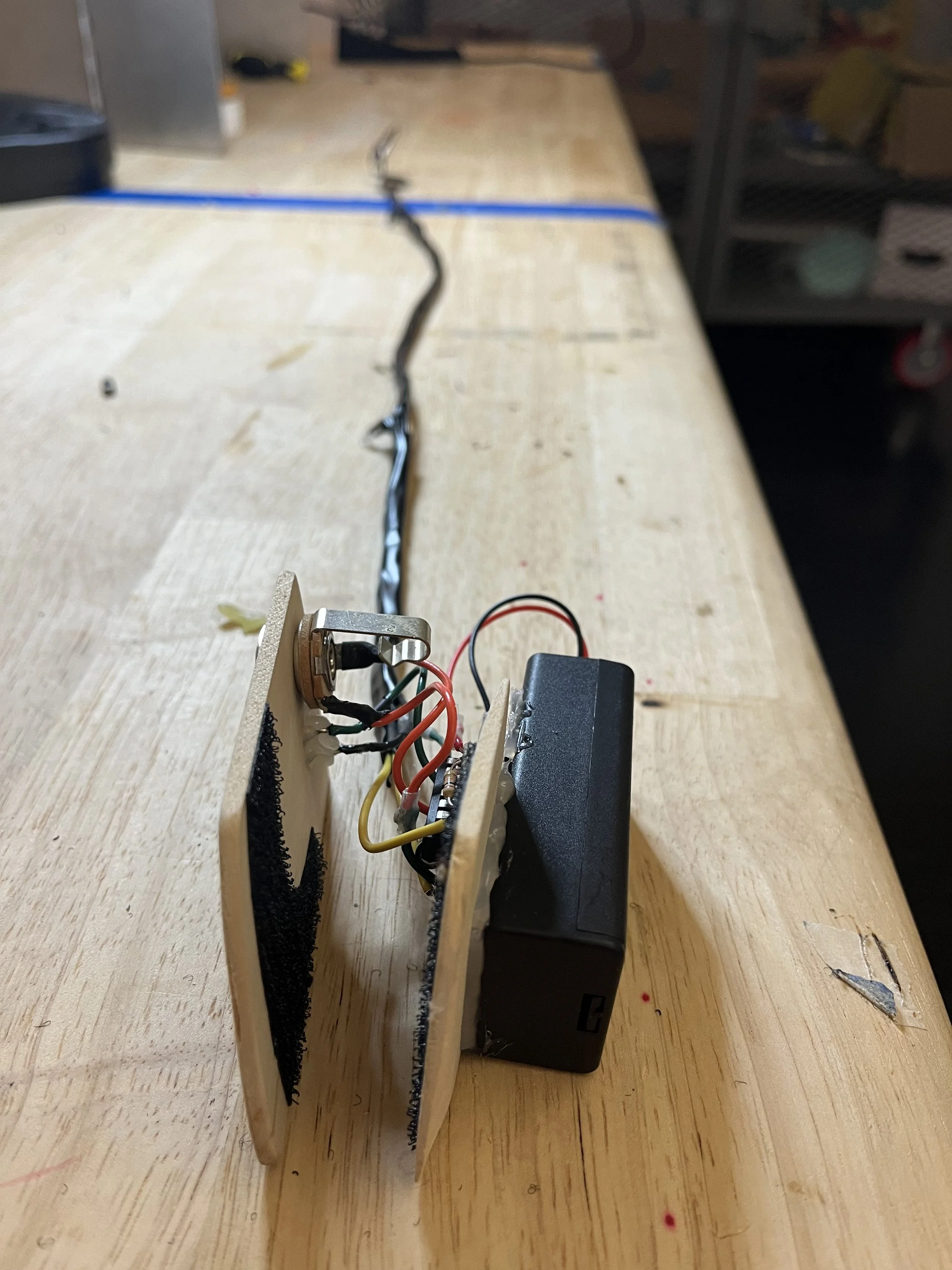 The circuit requires a 9v battery to run. I attached the battery pack on the player’s side of the bow.